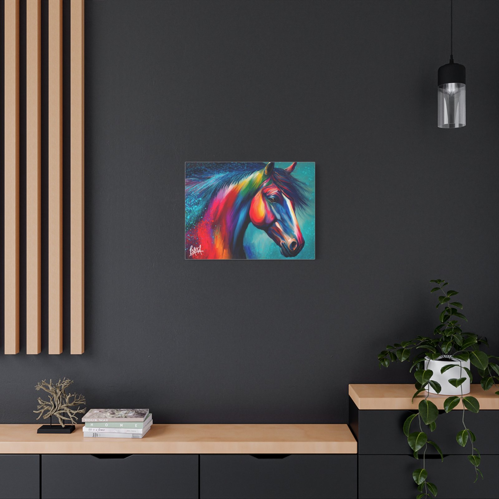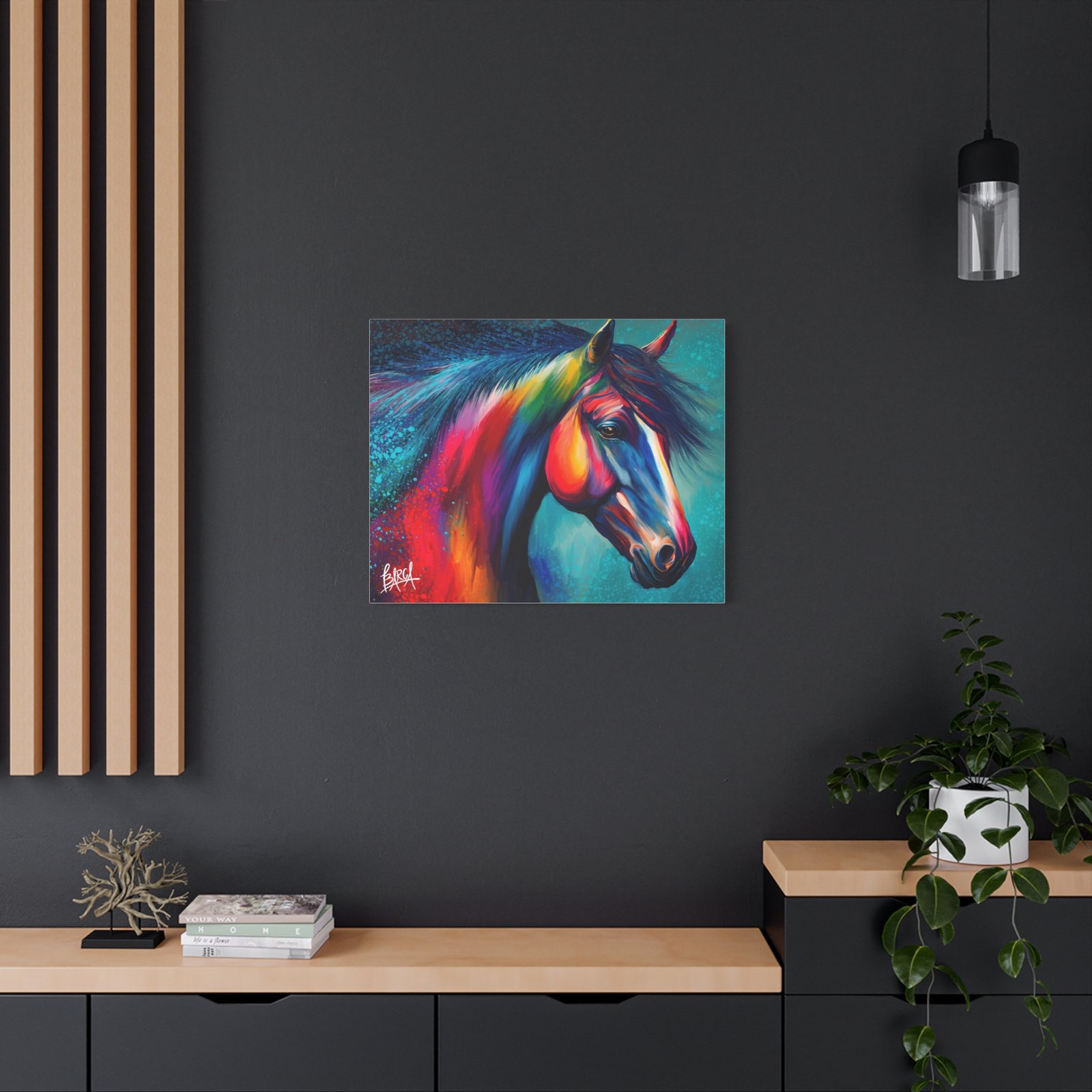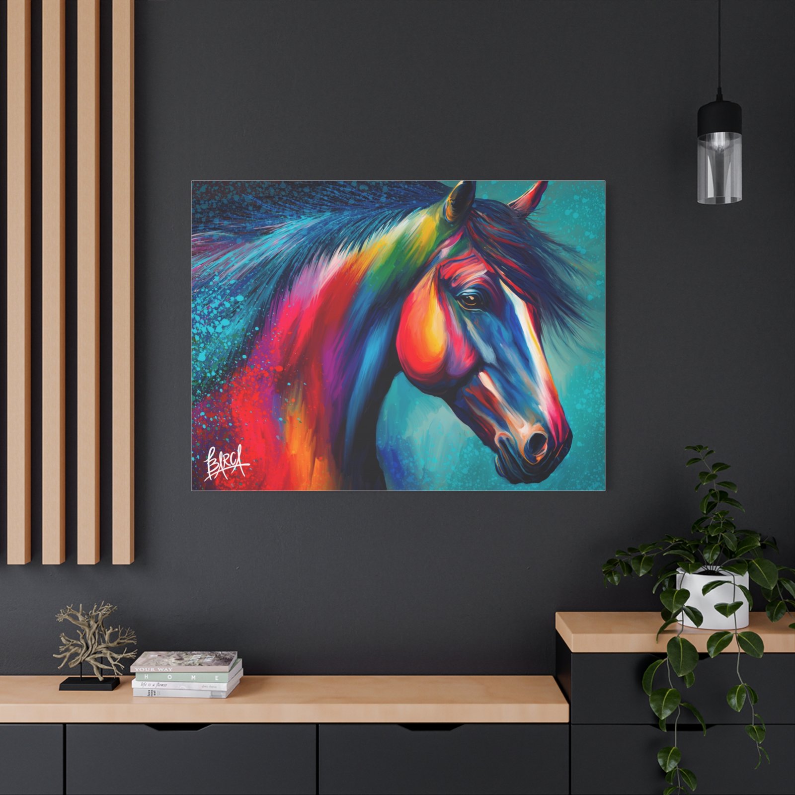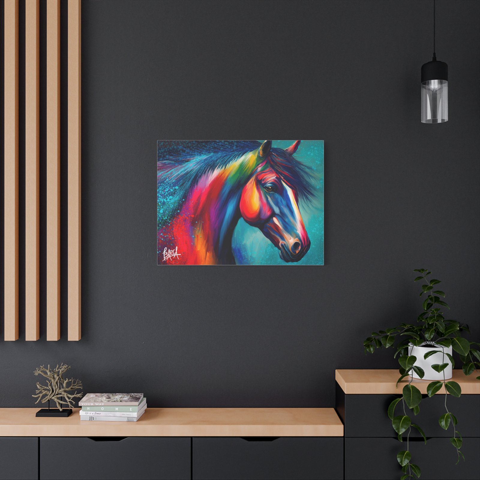 Transform your living space with this vibrant stretched canvas featuring a stunning colorful horse design. The artwork infuses energy and creativity into any room, making it a perfect focal point for your home or office. Ideal for horse lovers, art enthusiasts, or anyone looking to add a splash of color, this canvas is perfect for birthdays, housewarming gifts, or simply as a treat for yourself. Celebrate your passion for art and nature with a piece that inspires joy and imagination in your everyday life.
