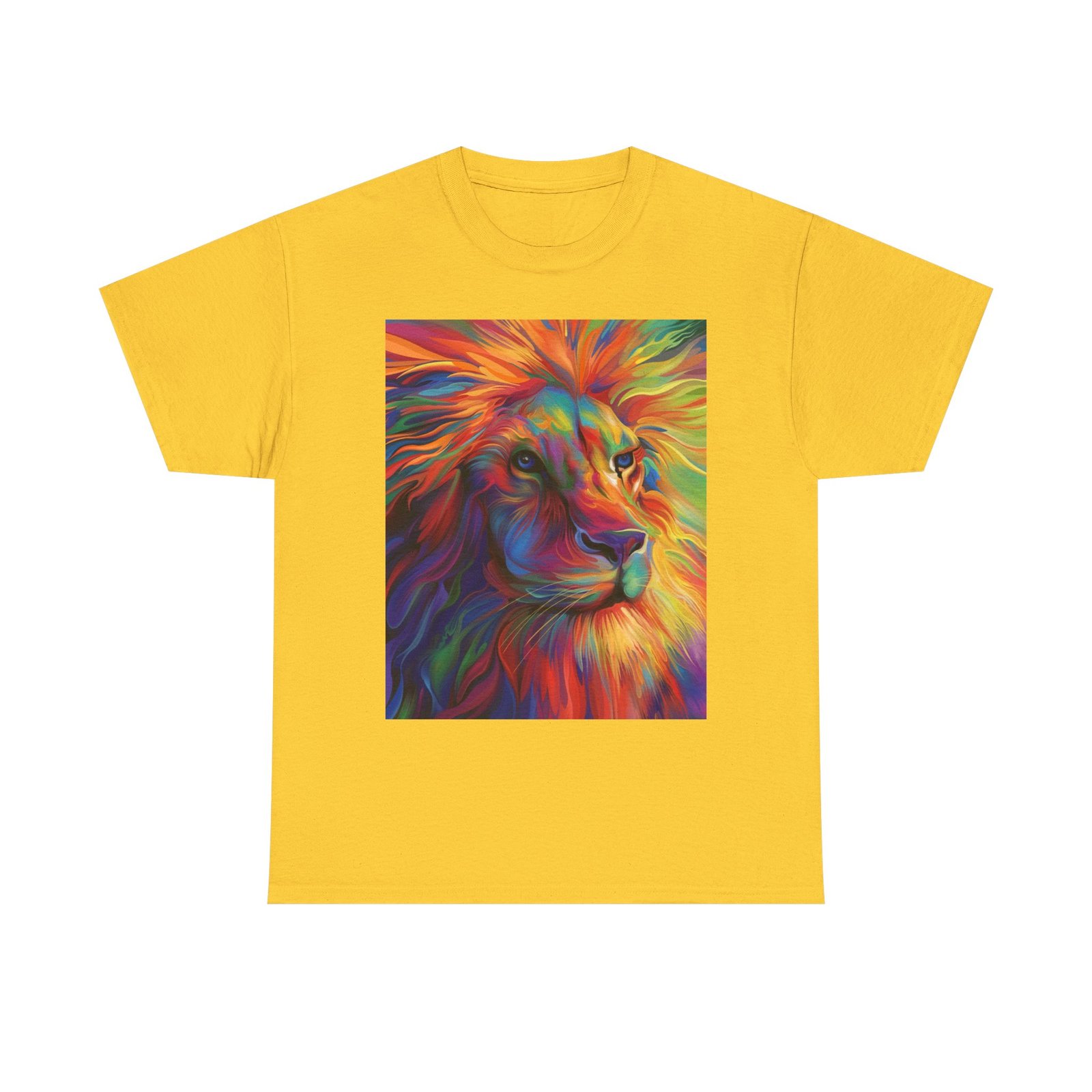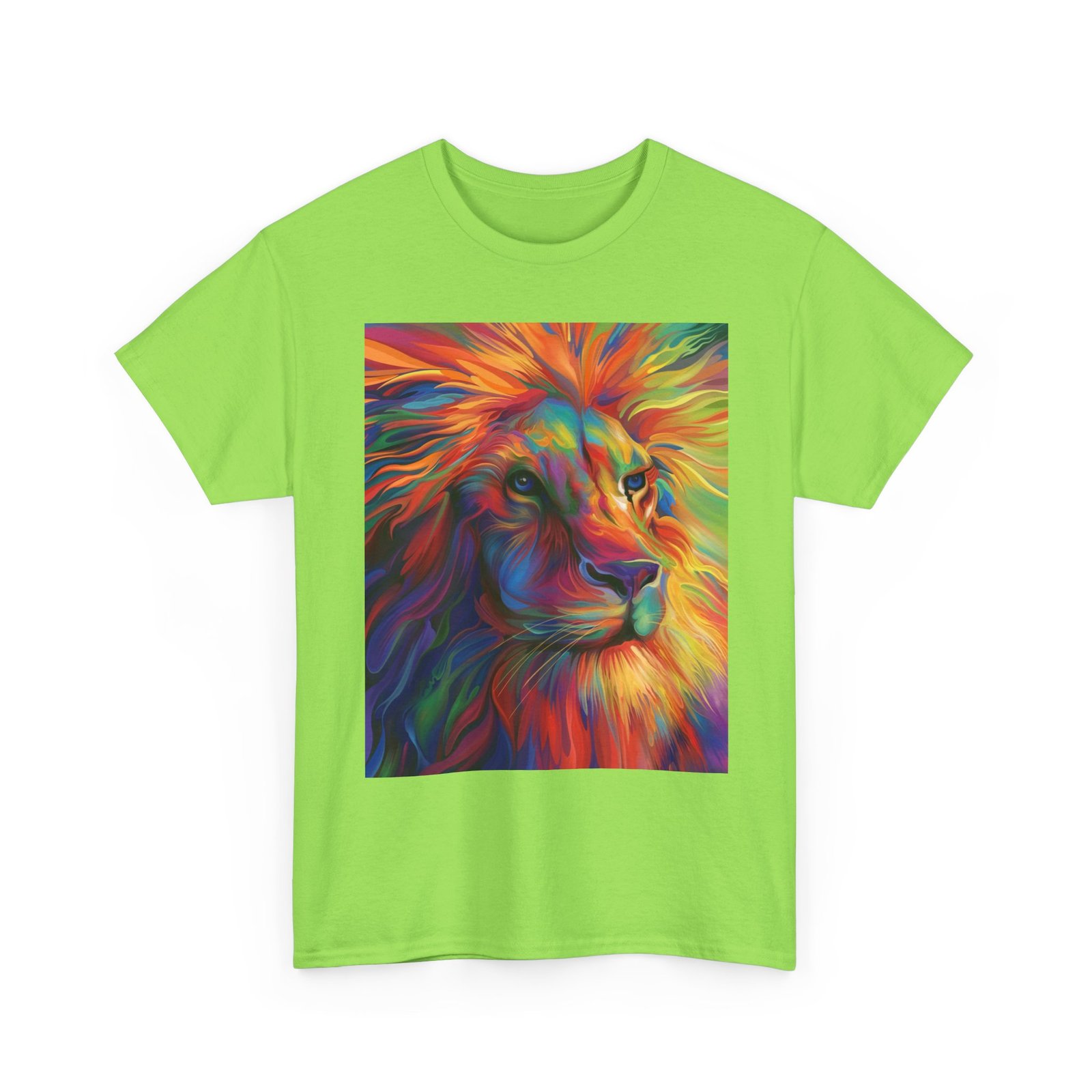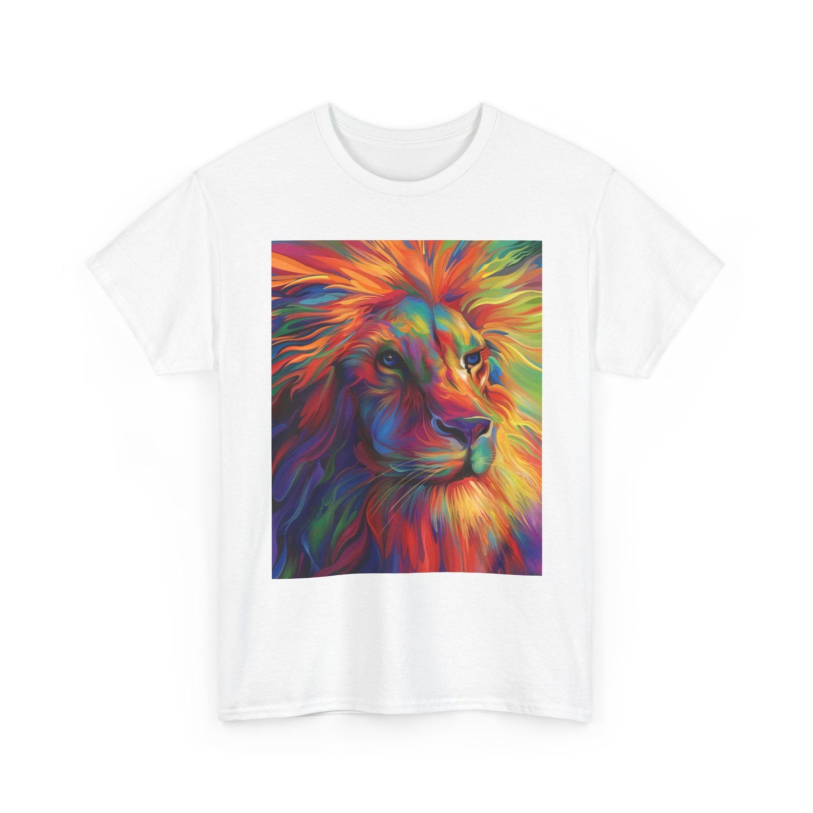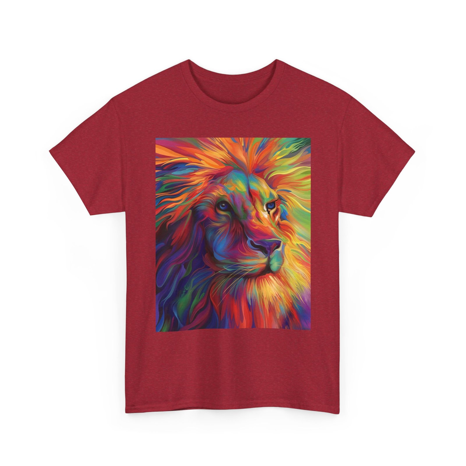 Make a bold statement with this striking tee, showcasing a vibrant and artistic lion design that radiates color and energy. Crafted from premium heavy cotton, it combines lasting comfort with a relaxed, versatile fit—perfect for everyday wear, casual gatherings, or adding a creative edge to your look.