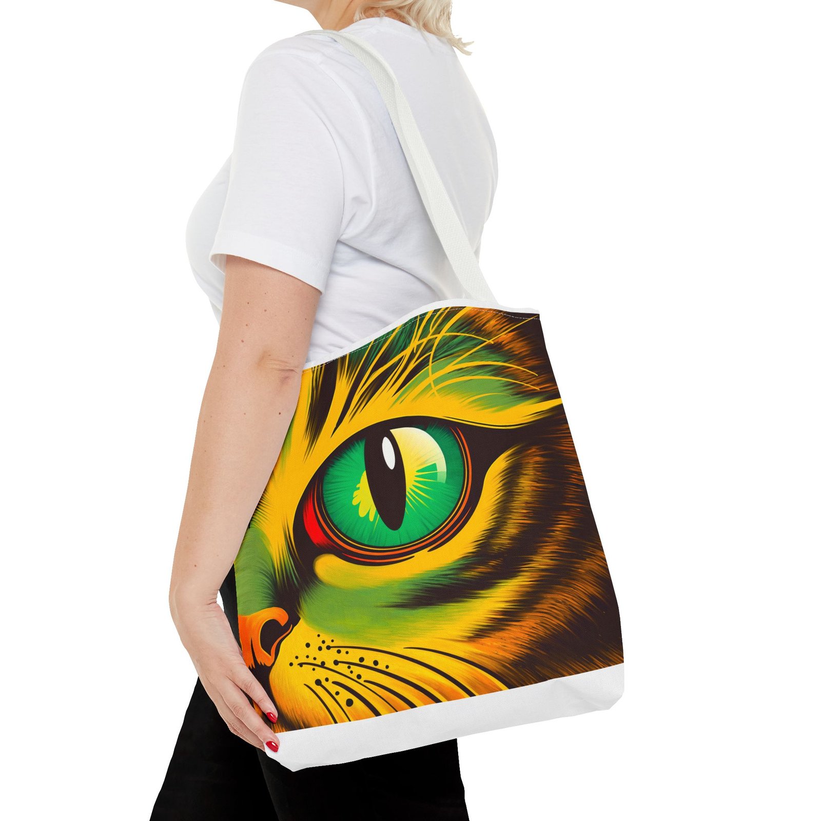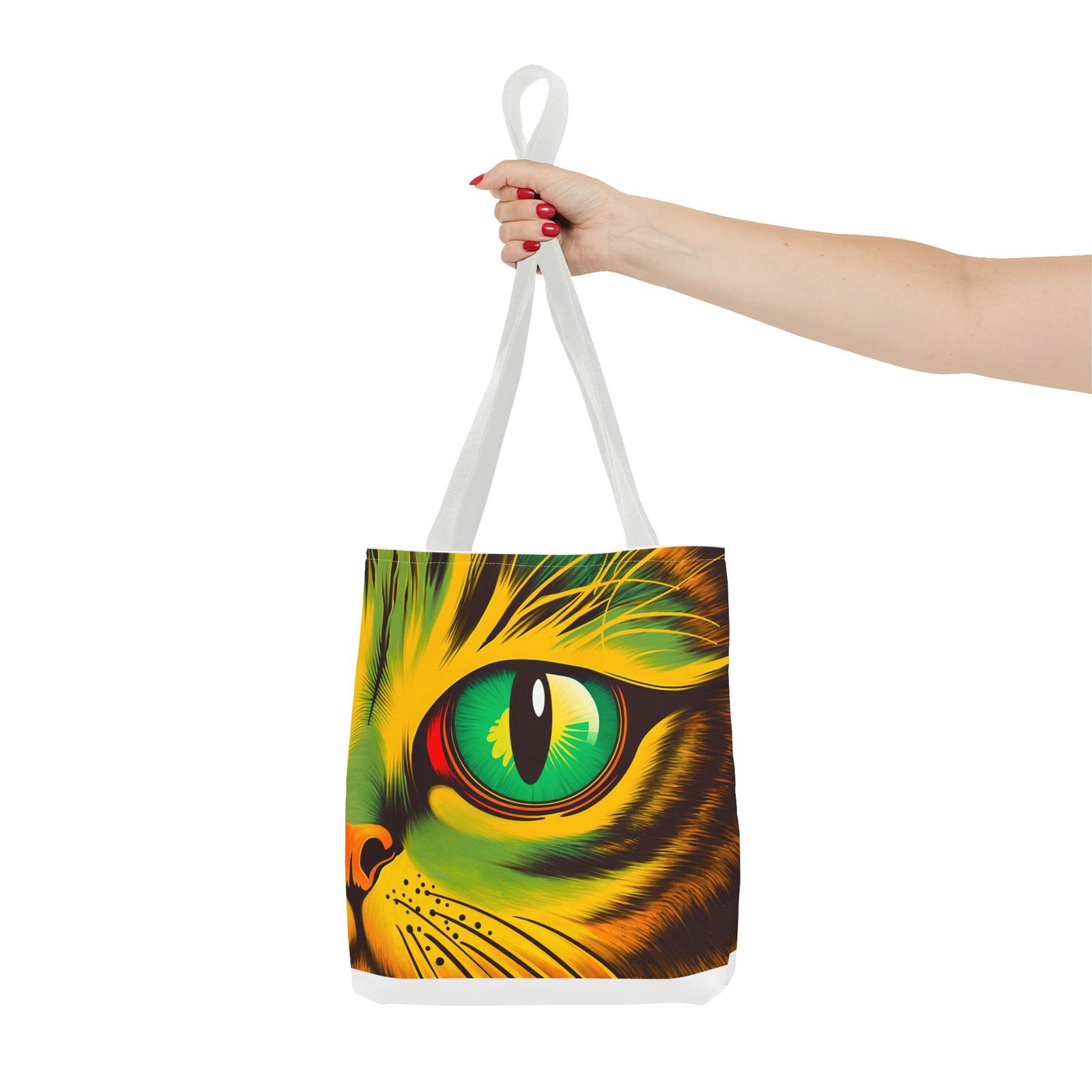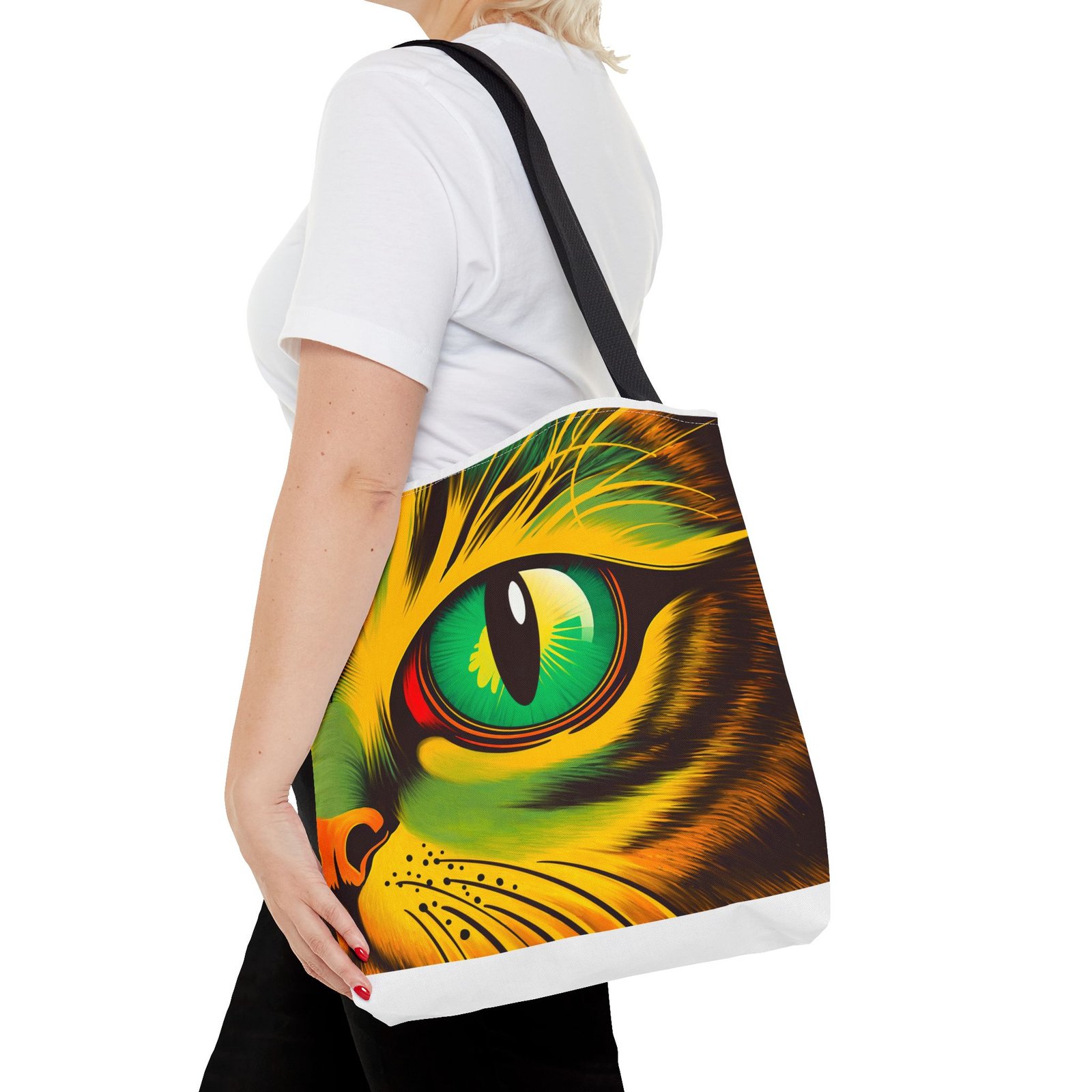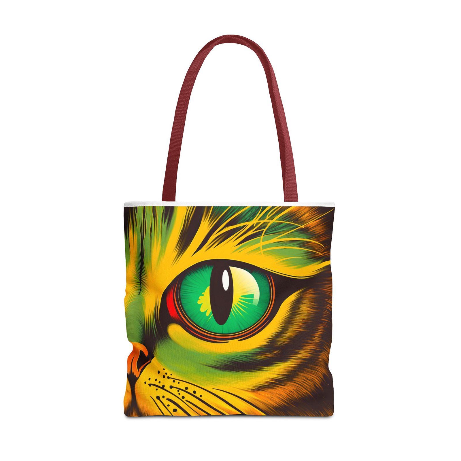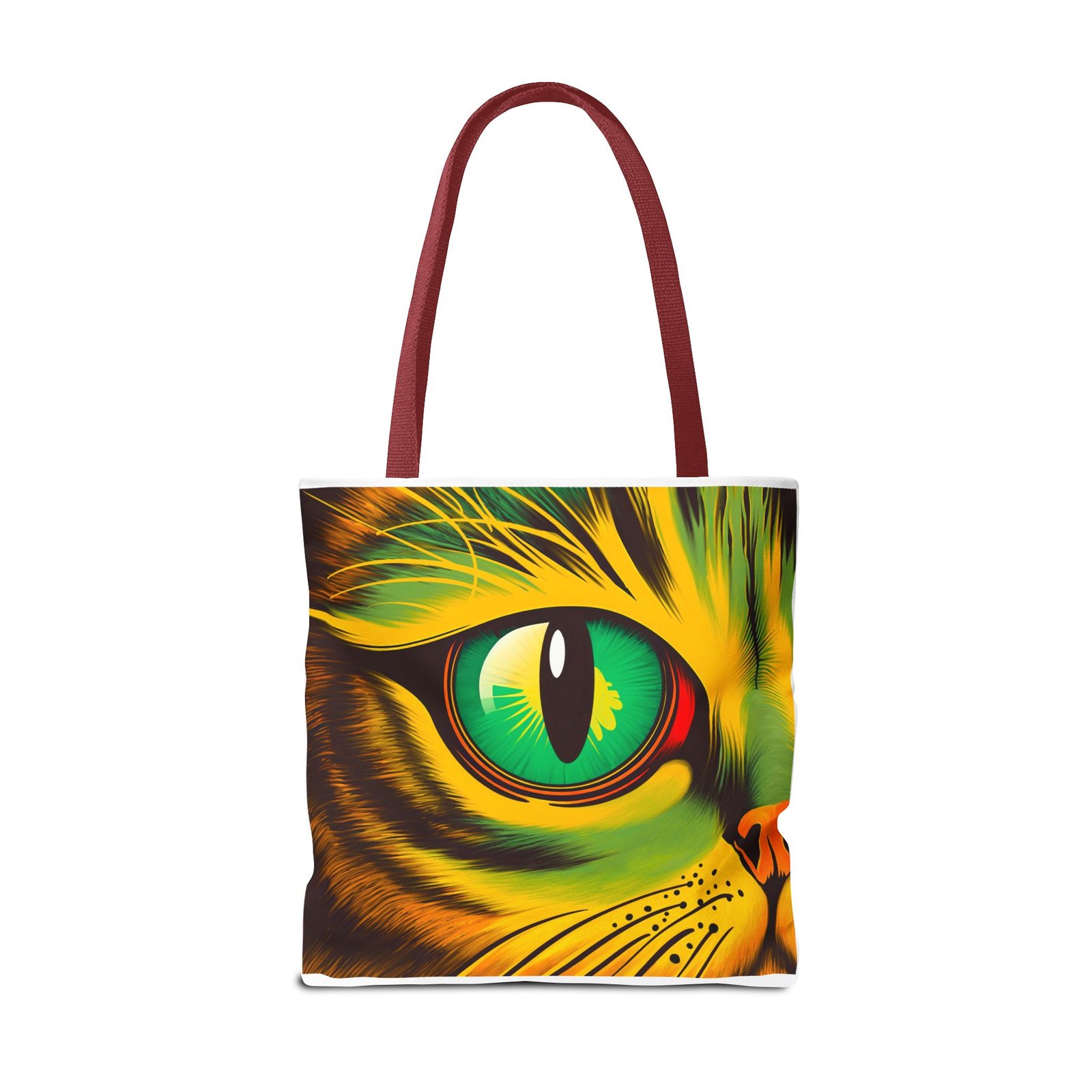Elevate your style with this vibrant Tote Bag. Adorned with a striking design that showcases a mesmerizing feline gaze, this tote is perfect for cat lovers and anyone who enjoys a pop of color in their accessories. Its durable polyester construction ensures that it withstands everyday use, whether you’re heading to the market, a day at the beach, or just need a reliable bag for on-the-go essentials. With various size options available, it can accommodate everything from books to groceries, making it a versatile addition to any wardrobe. Ideal for birthdays, cat-themed parties, or as a thoughtful gift during the holiday season, this tote bag adds a playful yet sophisticated touch to your daily adventures. Perfect for women and men alike, it’s a functional piece that celebrates a love for pets while offering practicality.