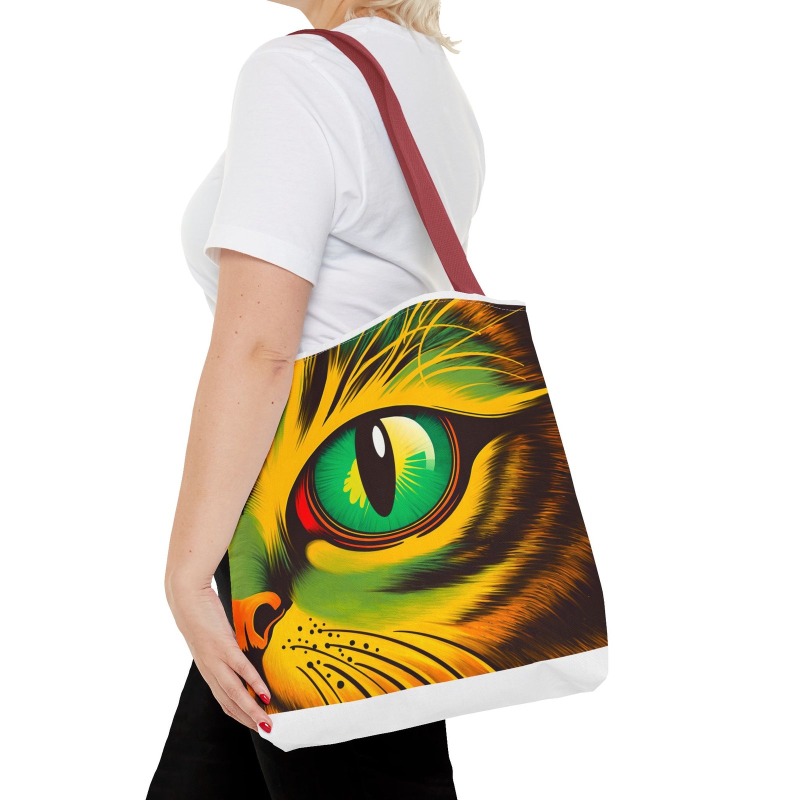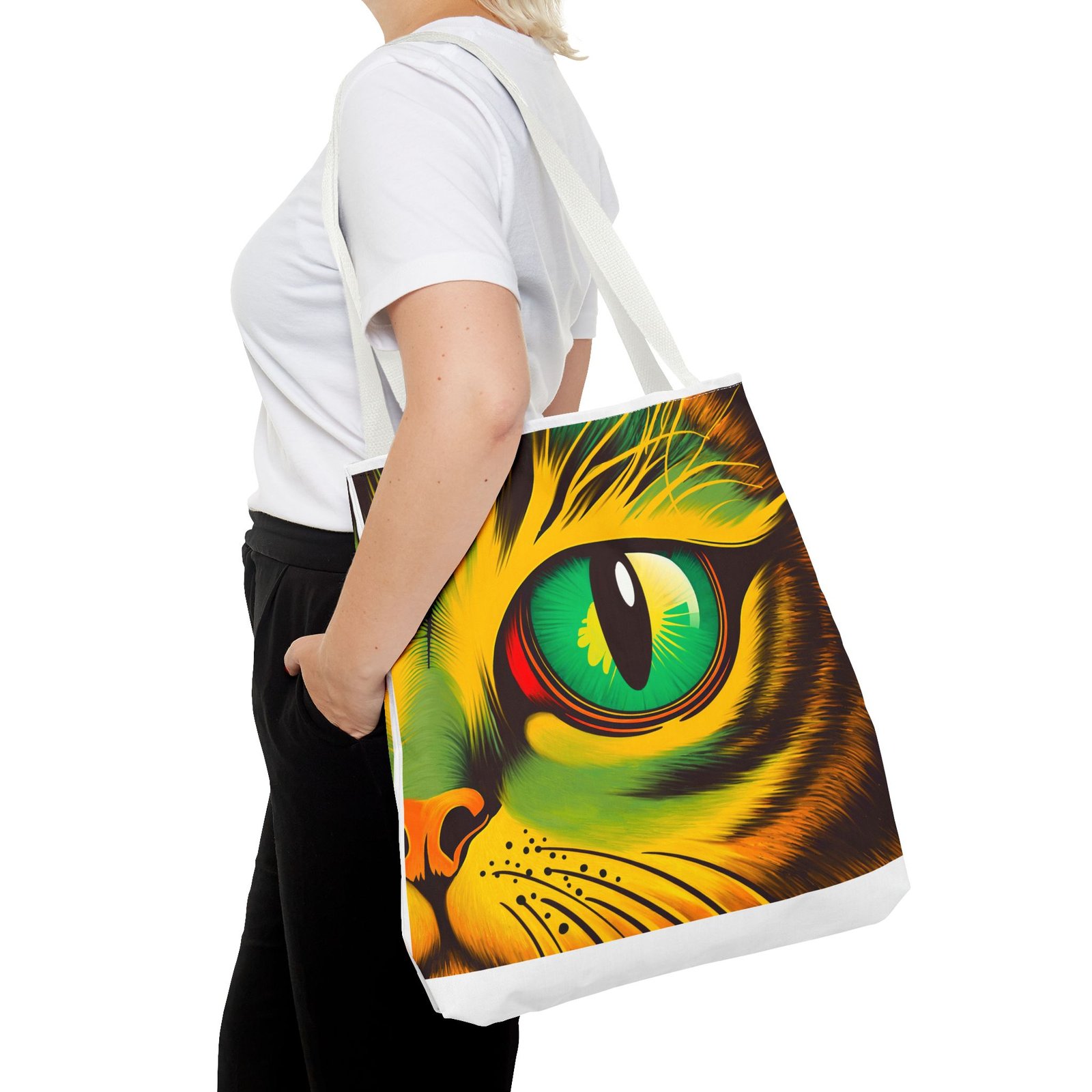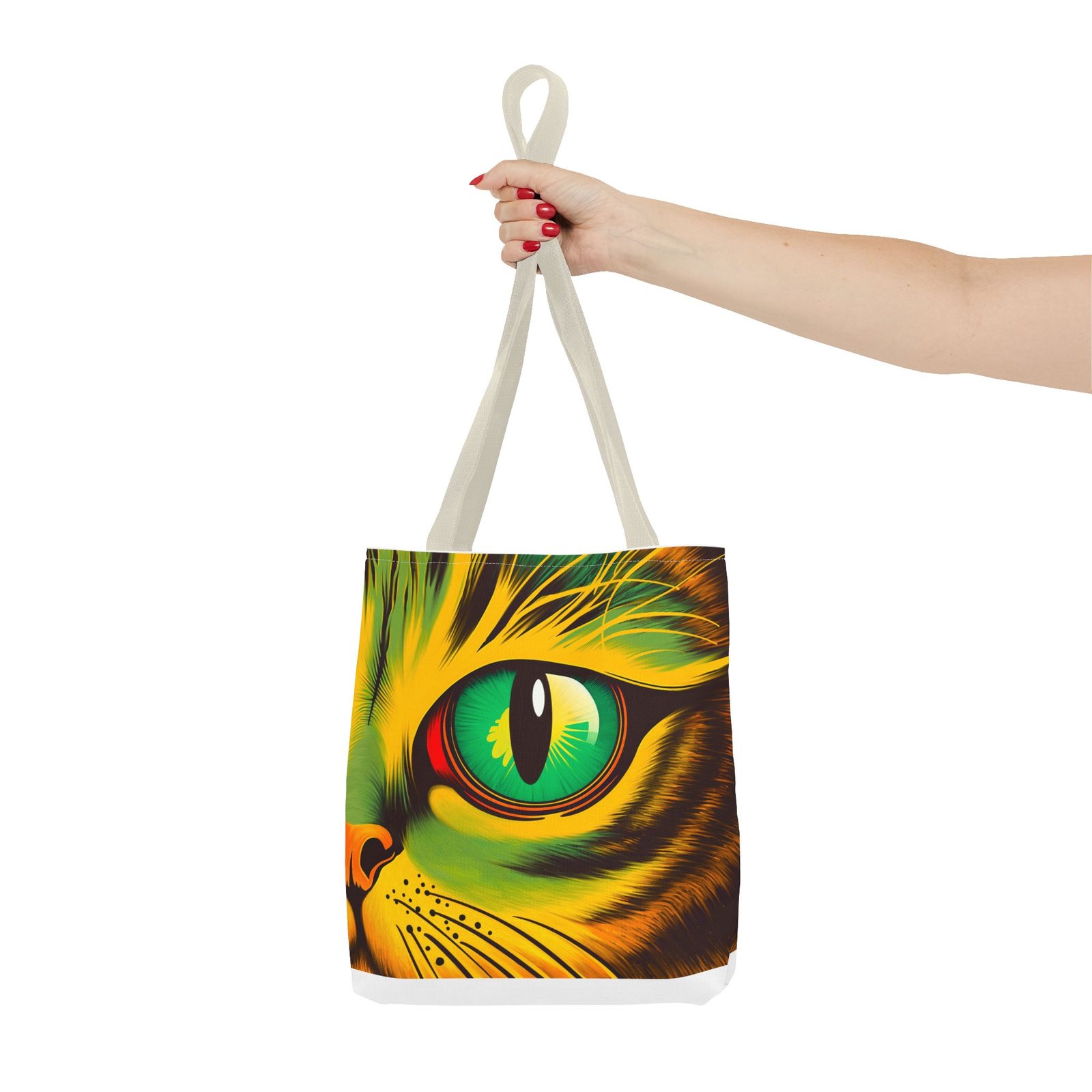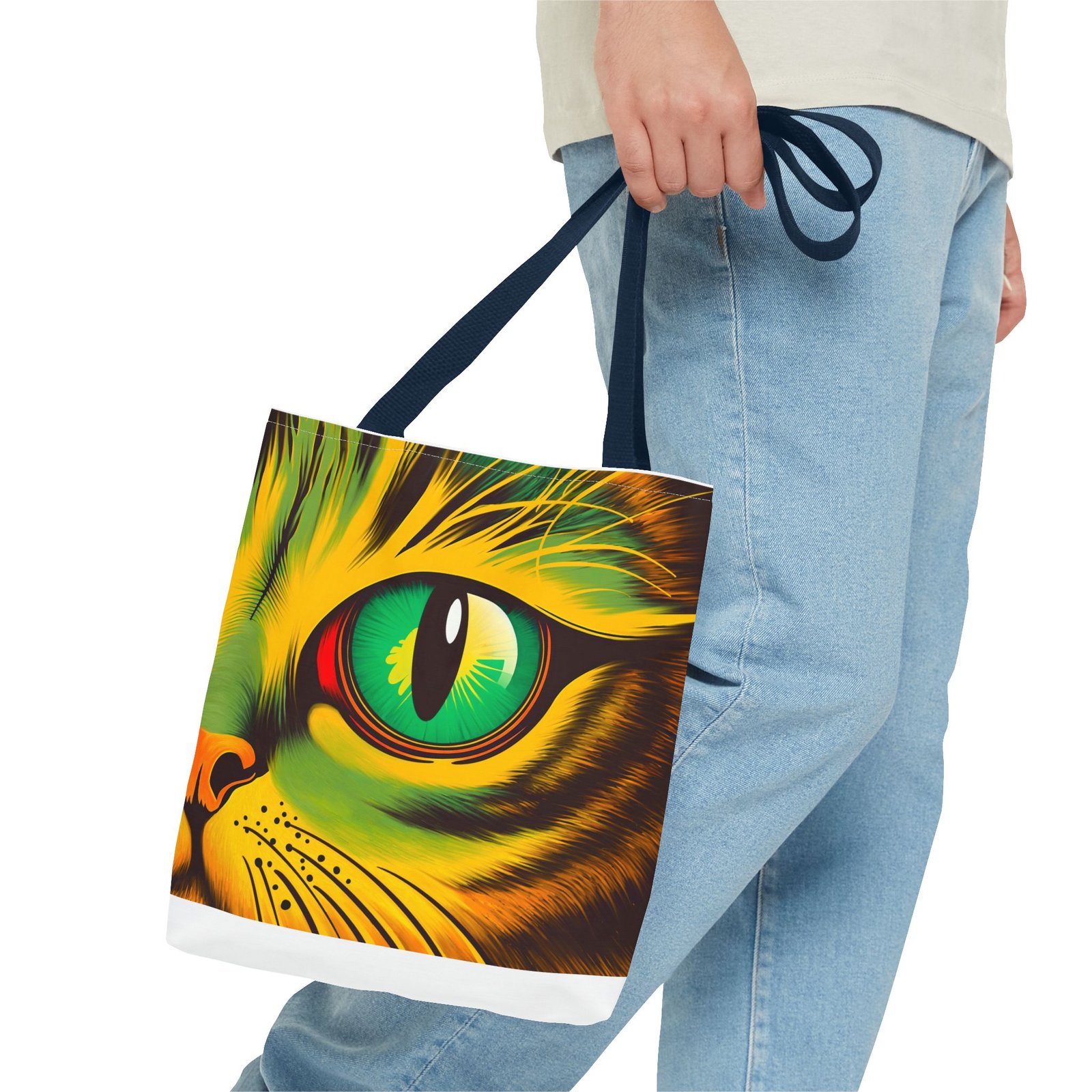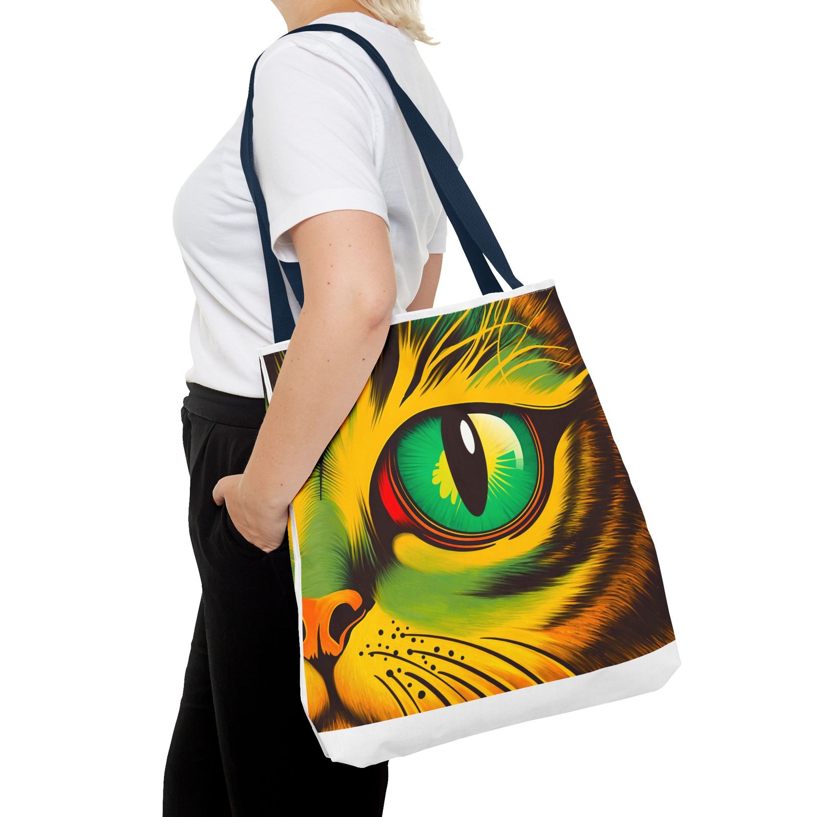 Elevate your style with this vibrant Tote Bag. Adorned with a striking design that showcases a mesmerizing feline gaze, this tote is perfect for cat lovers and anyone who enjoys a pop of color in their accessories. Its durable polyester construction ensures that it withstands everyday use, whether you’re heading to the market, a day at the beach, or just need a reliable bag for on-the-go essentials. With various size options available, it can accommodate everything from books to groceries, making it a versatile addition to any wardrobe. Ideal for birthdays, cat-themed parties, or as a thoughtful gift during the holiday season, this tote bag adds a playful yet sophisticated touch to your daily adventures. Perfect for women and men alike, it’s a functional piece that celebrates a love for pets while offering practicality.