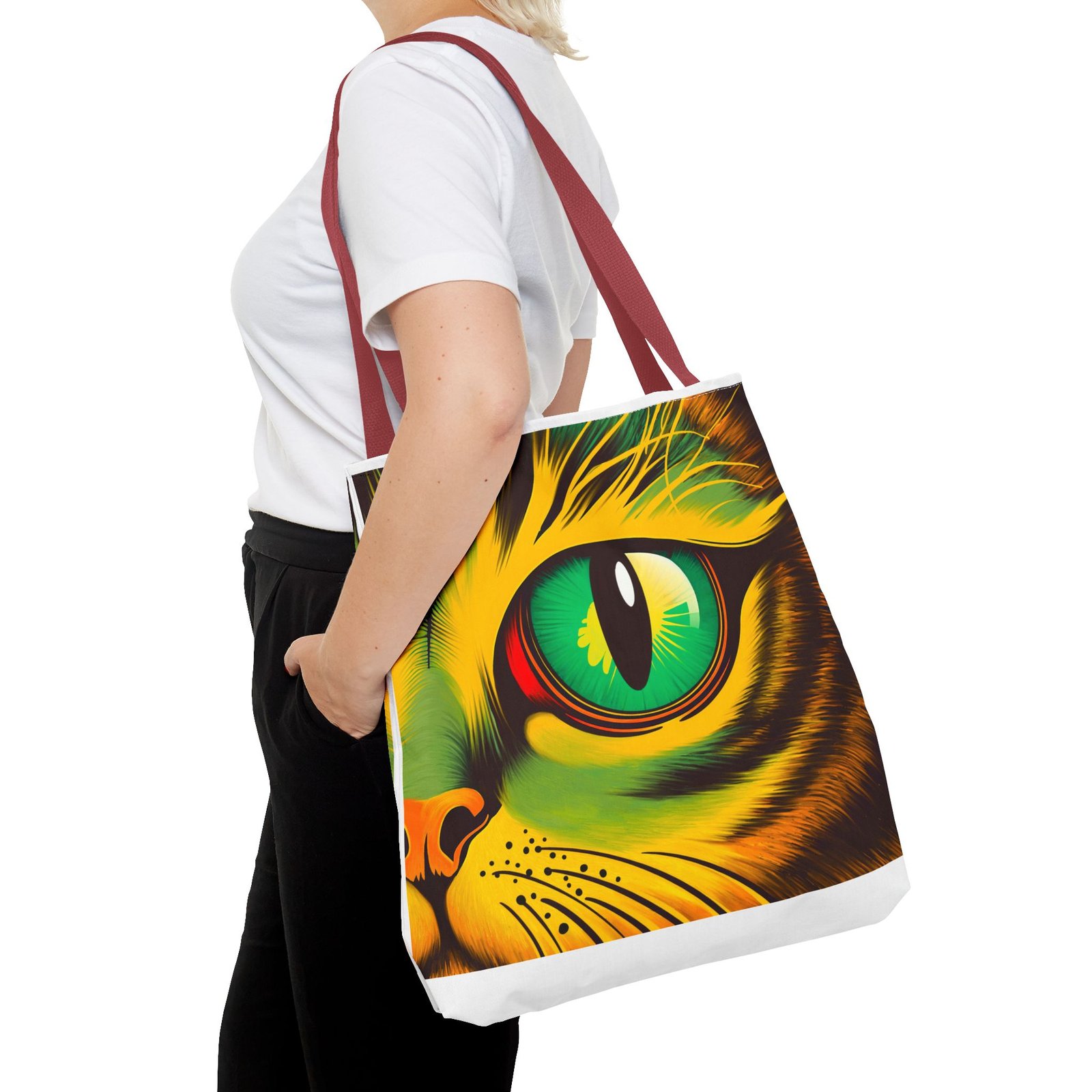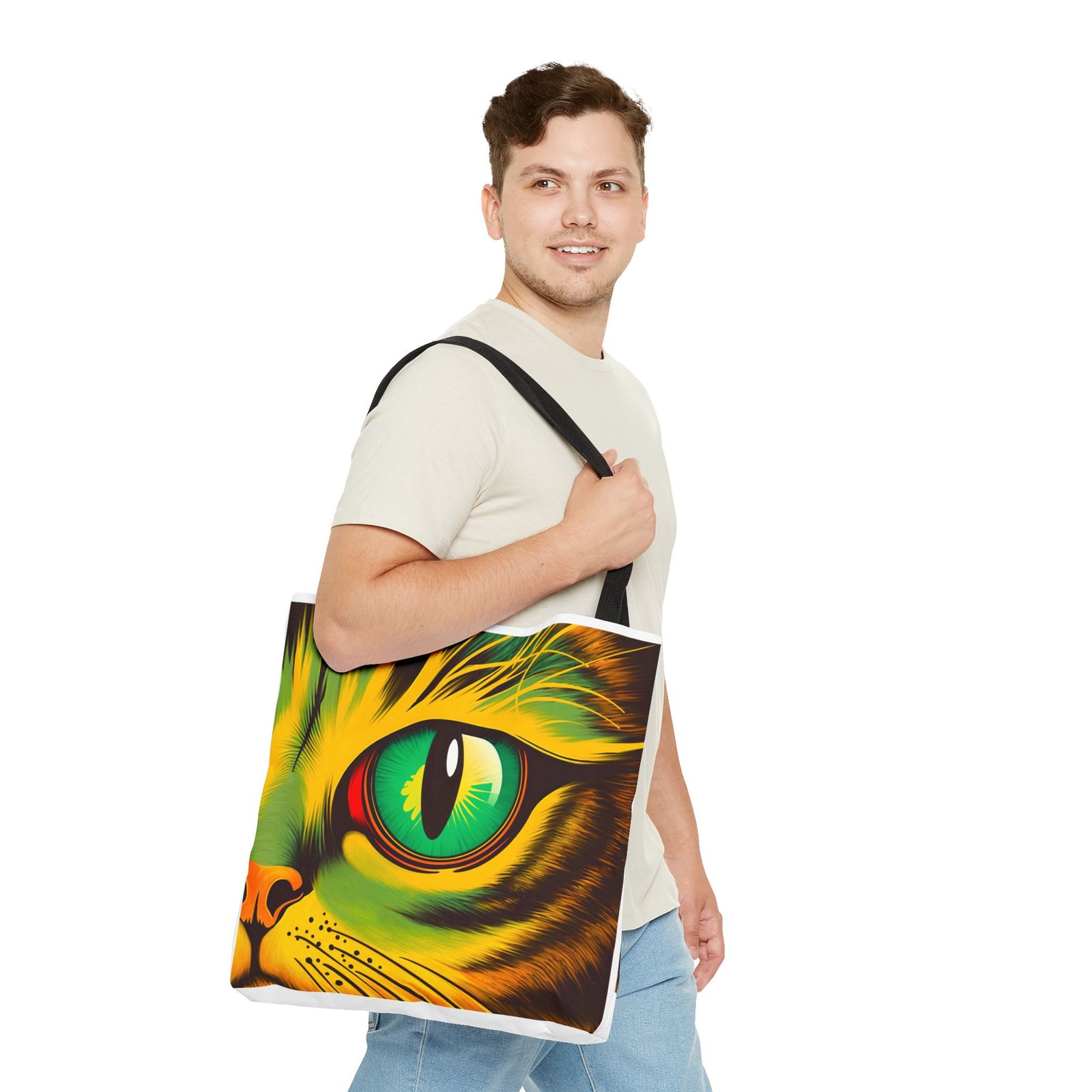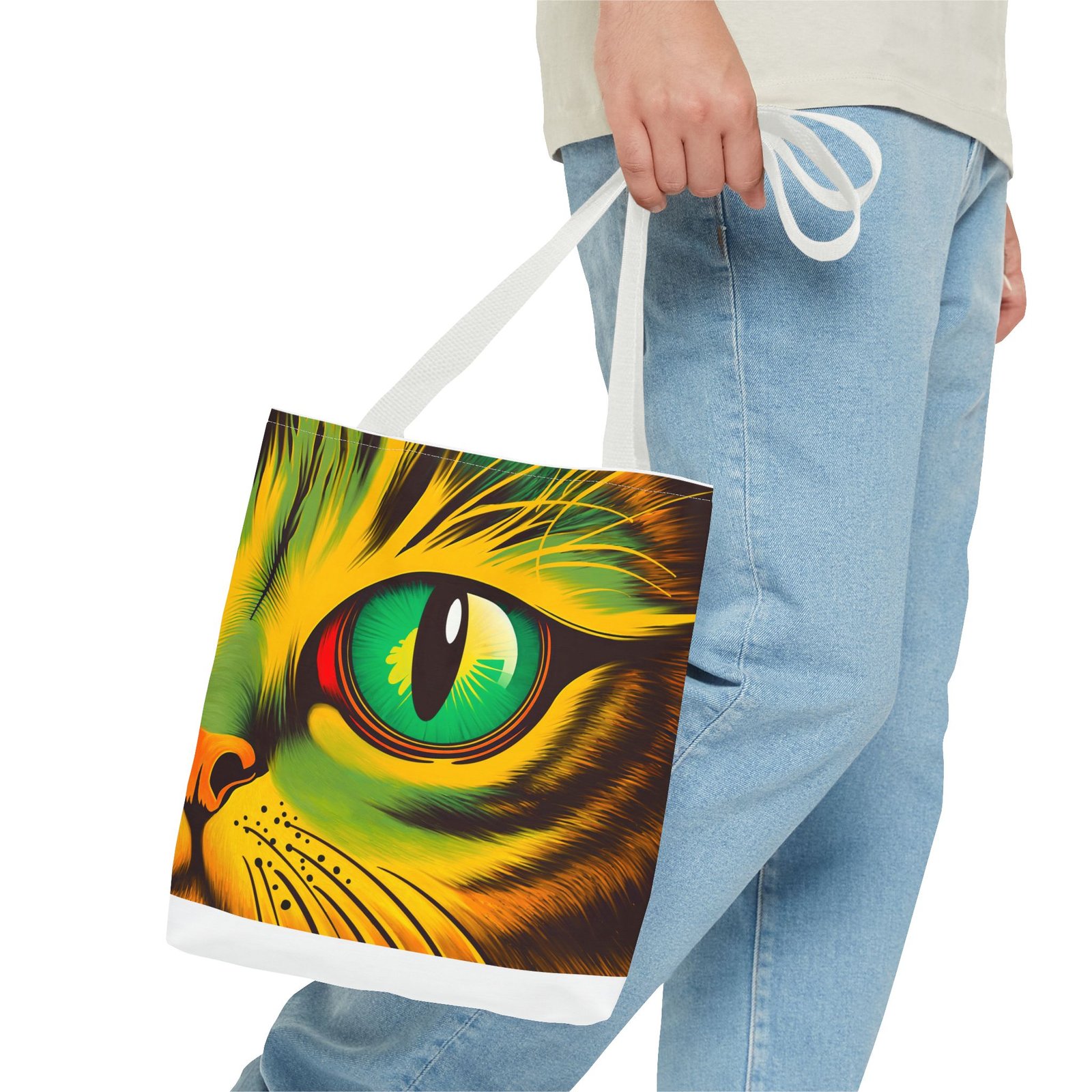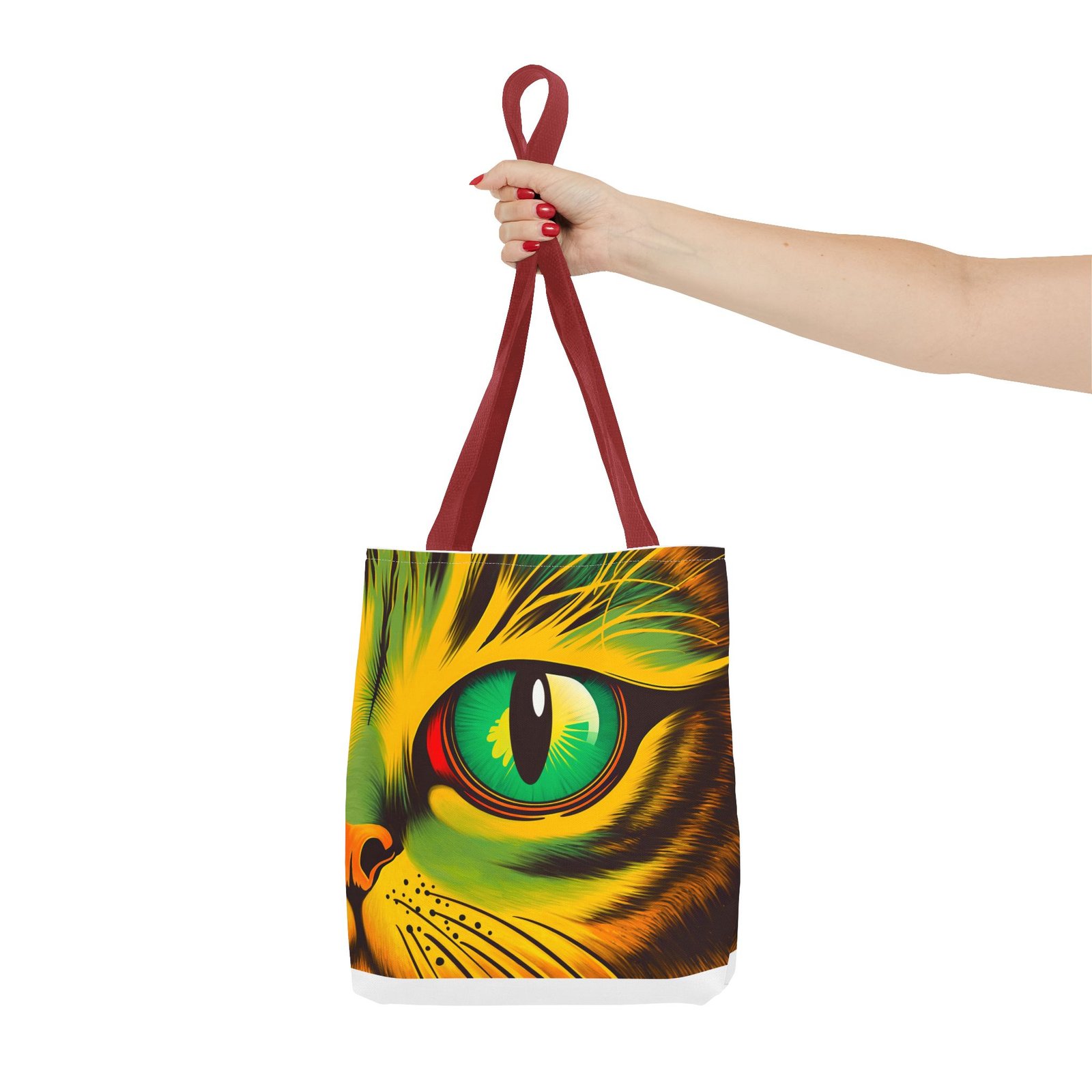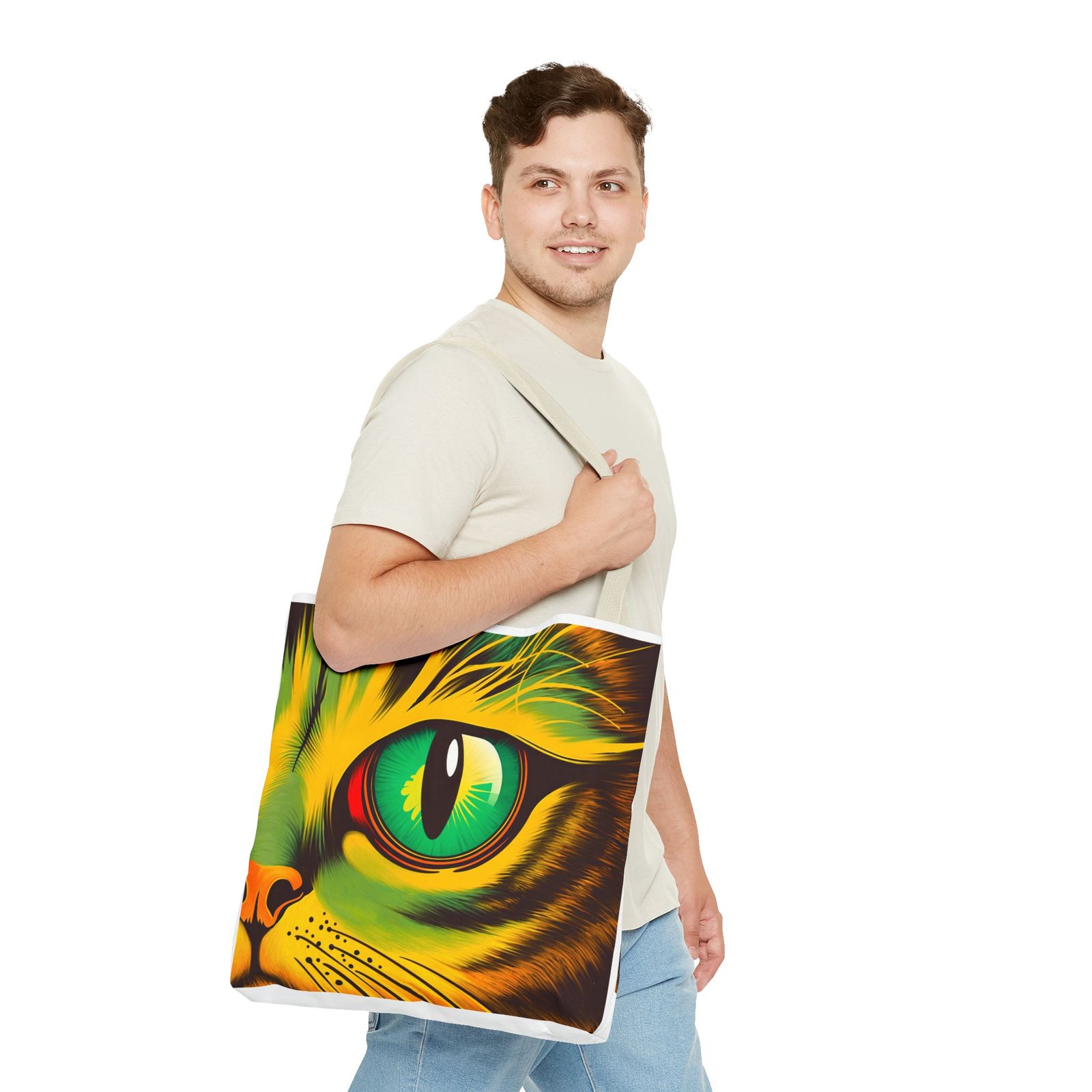 Elevate your style with this vibrant Tote Bag. Adorned with a striking design that showcases a mesmerizing feline gaze, this tote is perfect for cat lovers and anyone who enjoys a pop of color in their accessories. Its durable polyester construction ensures that it withstands everyday use, whether you’re heading to the market, a day at the beach, or just need a reliable bag for on-the-go essentials. With various size options available, it can accommodate everything from books to groceries, making it a versatile addition to any wardrobe. Ideal for birthdays, cat-themed parties, or as a thoughtful gift during the holiday season, this tote bag adds a playful yet sophisticated touch to your daily adventures. Perfect for women and men alike, it’s a functional piece that celebrates a love for pets while offering practicality.