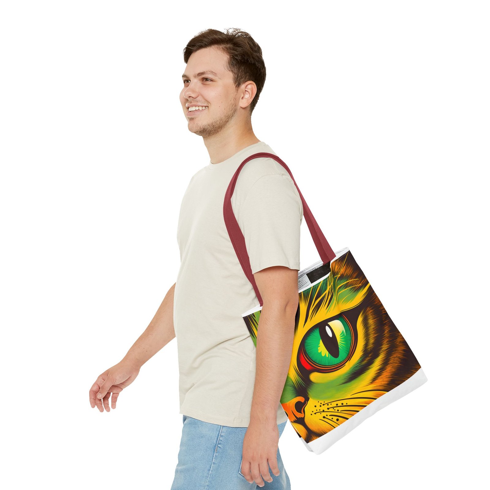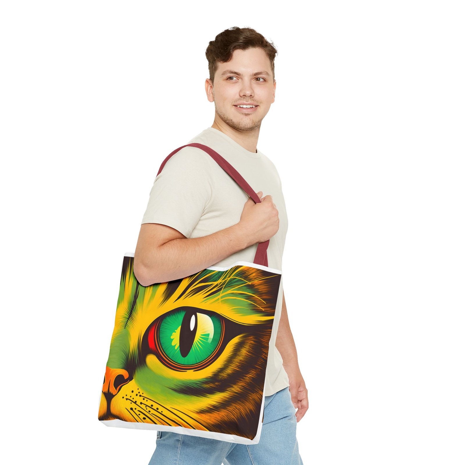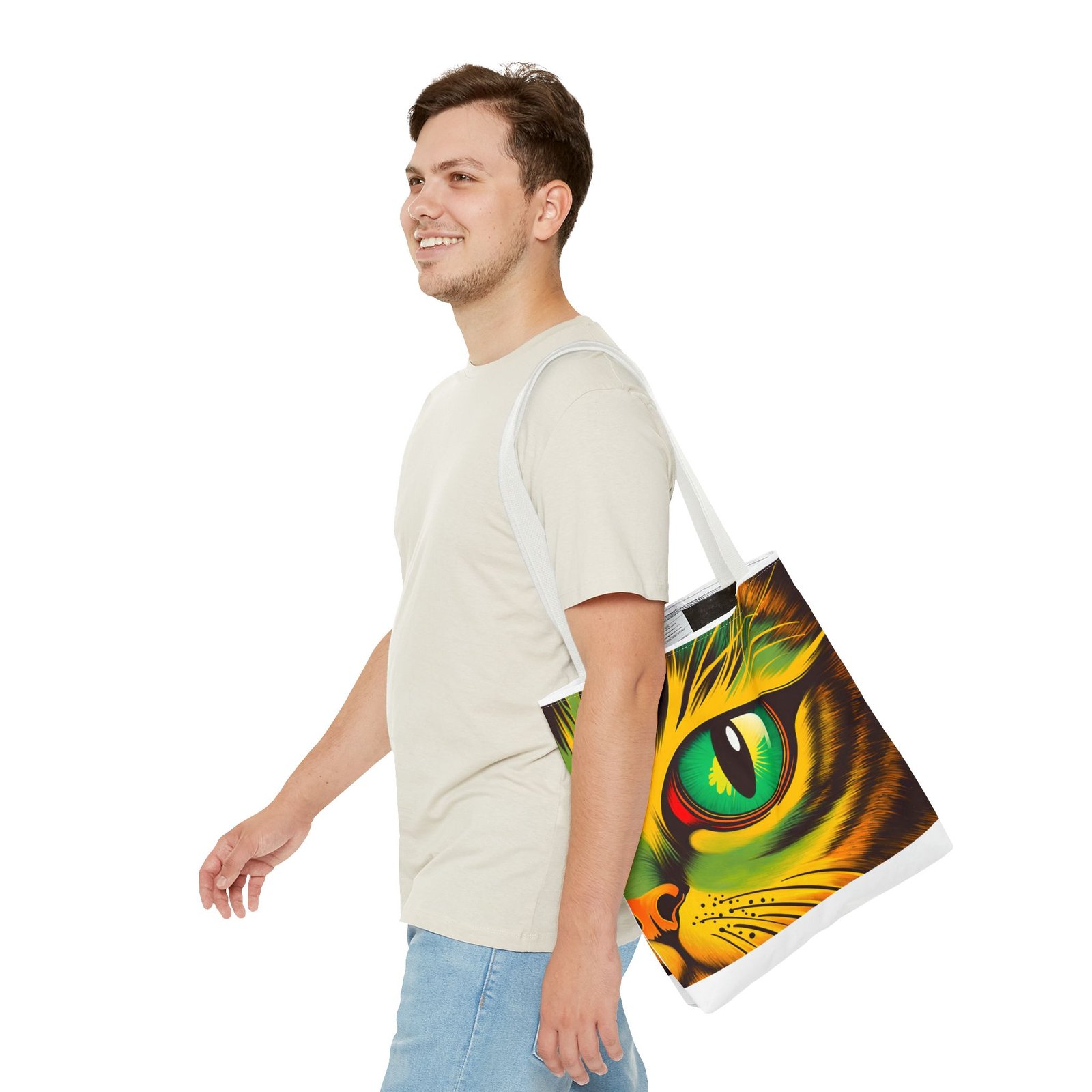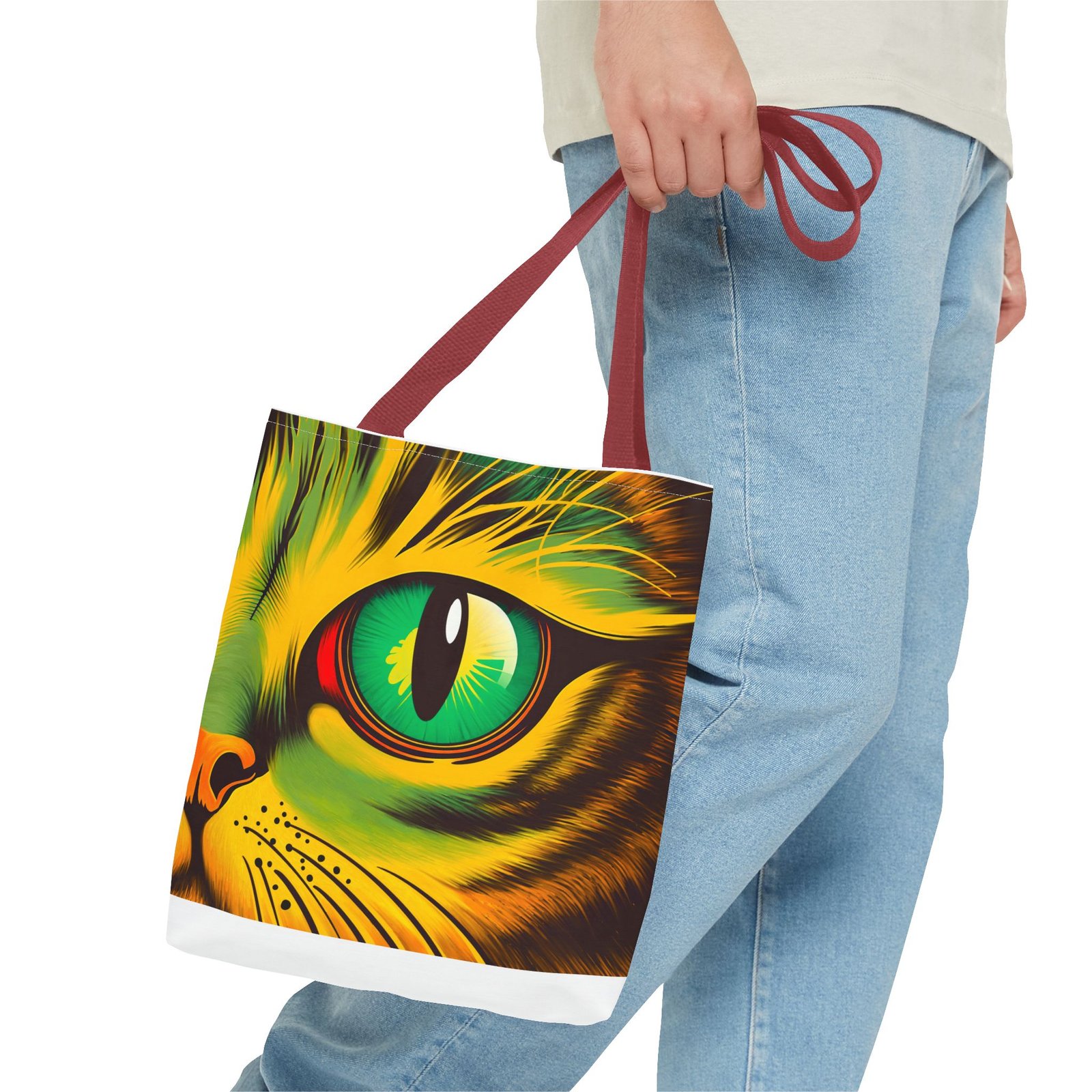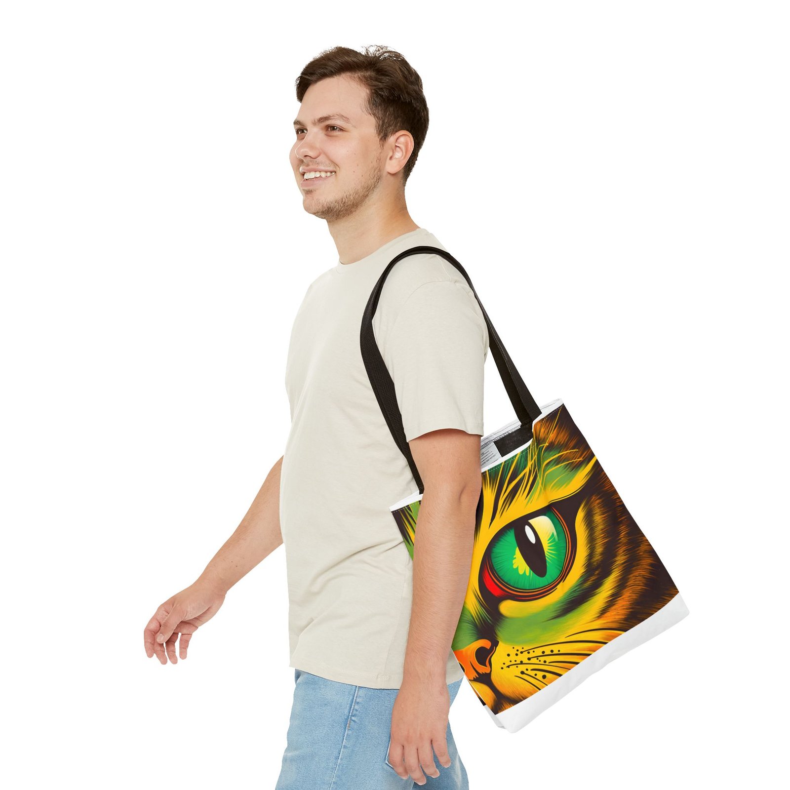Elevate your style with this vibrant Tote Bag. Adorned with a striking design that showcases a mesmerizing feline gaze, this tote is perfect for cat lovers and anyone who enjoys a pop of color in their accessories. Its durable polyester construction ensures that it withstands everyday use, whether you’re heading to the market, a day at the beach, or just need a reliable bag for on-the-go essentials. With various size options available, it can accommodate everything from books to groceries, making it a versatile addition to any wardrobe. Ideal for birthdays, cat-themed parties, or as a thoughtful gift during the holiday season, this tote bag adds a playful yet sophisticated touch to your daily adventures. Perfect for women and men alike, it’s a functional piece that celebrates a love for pets while offering practicality.