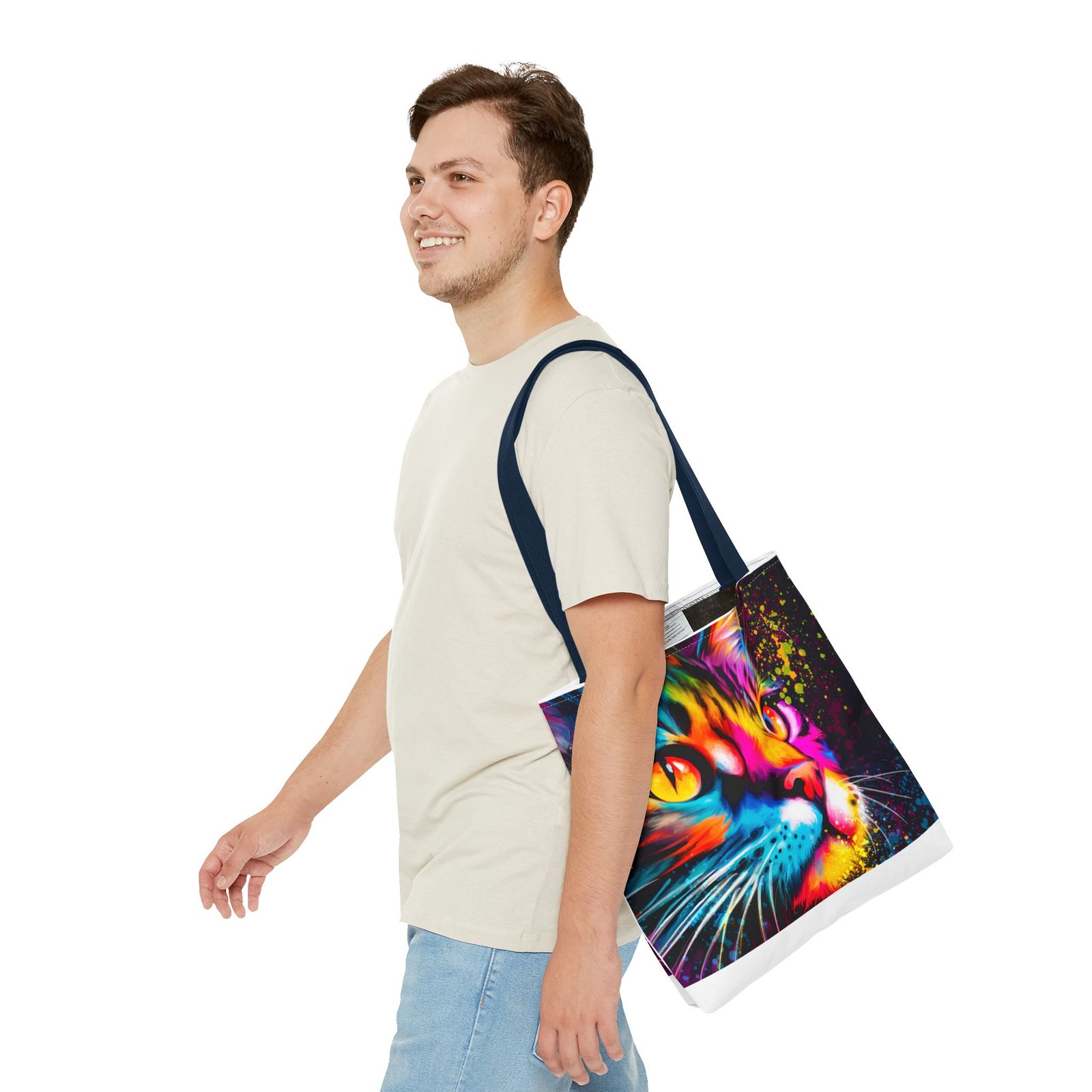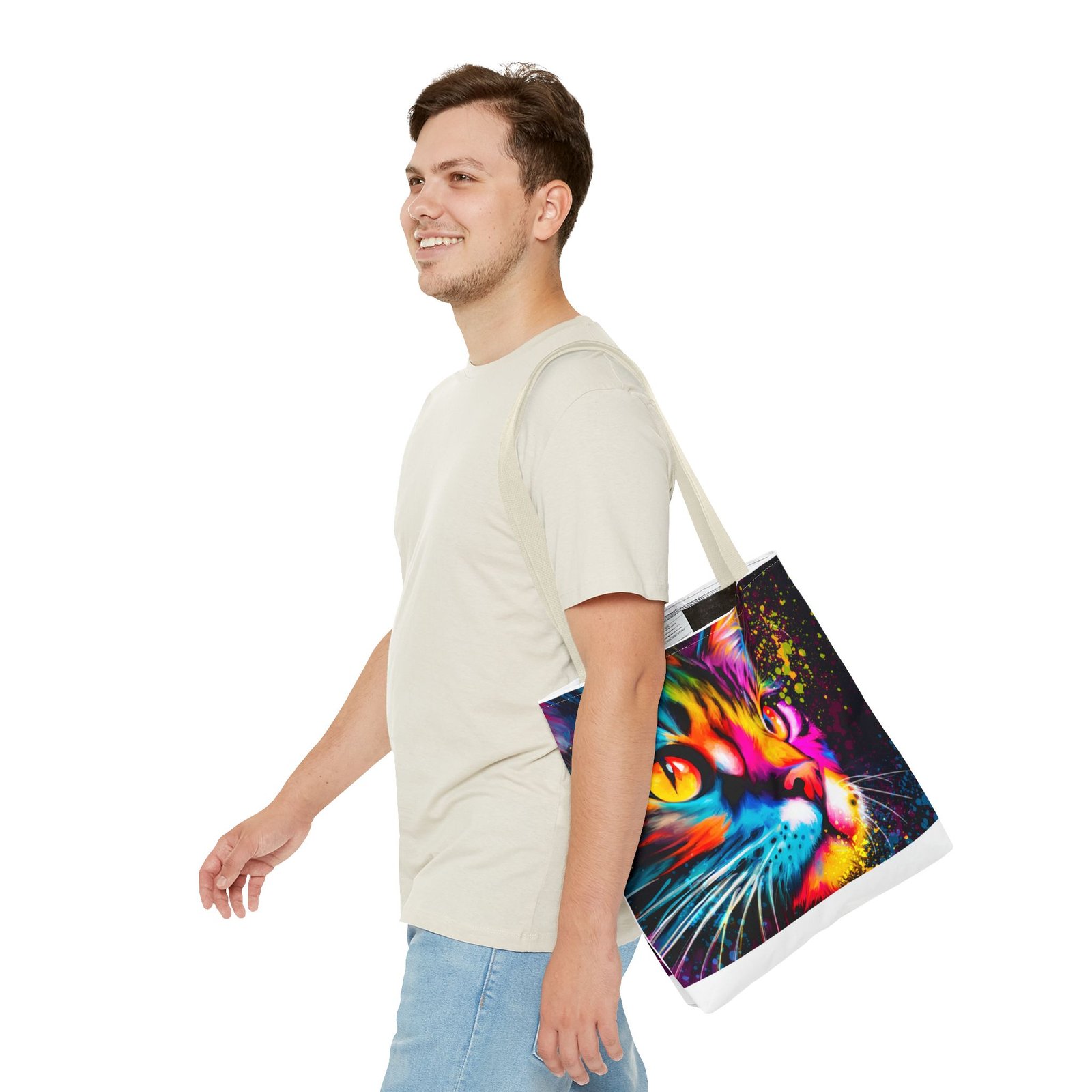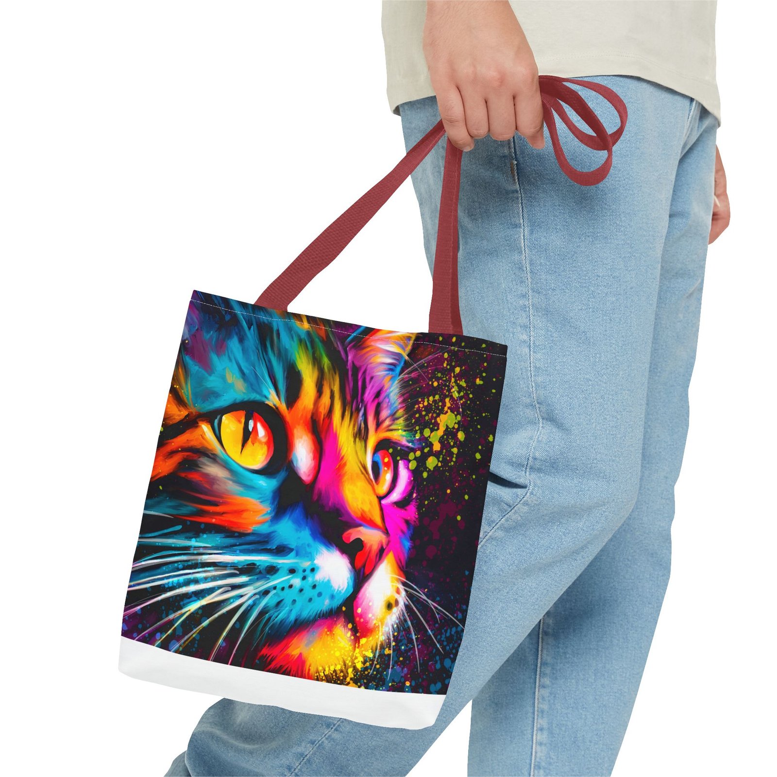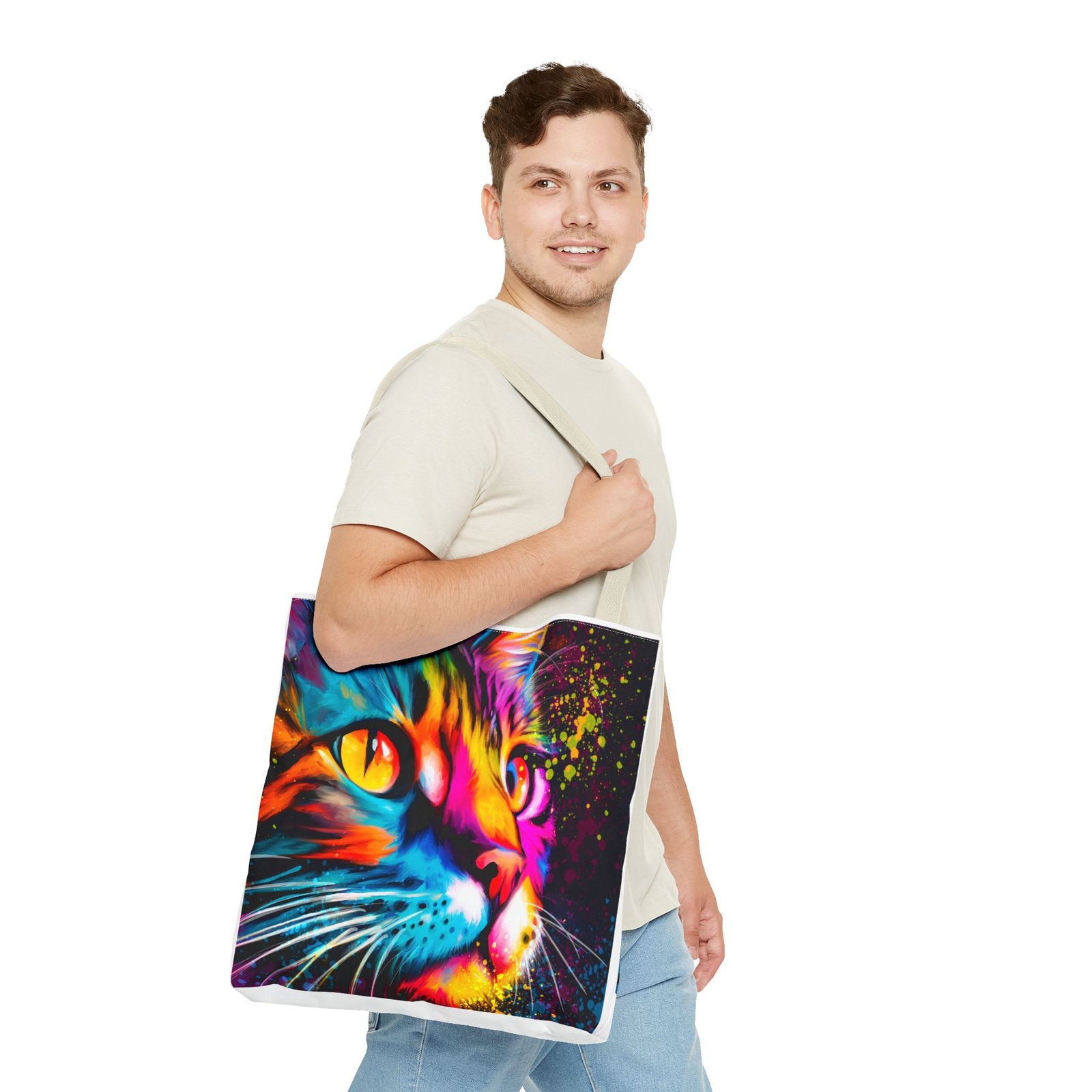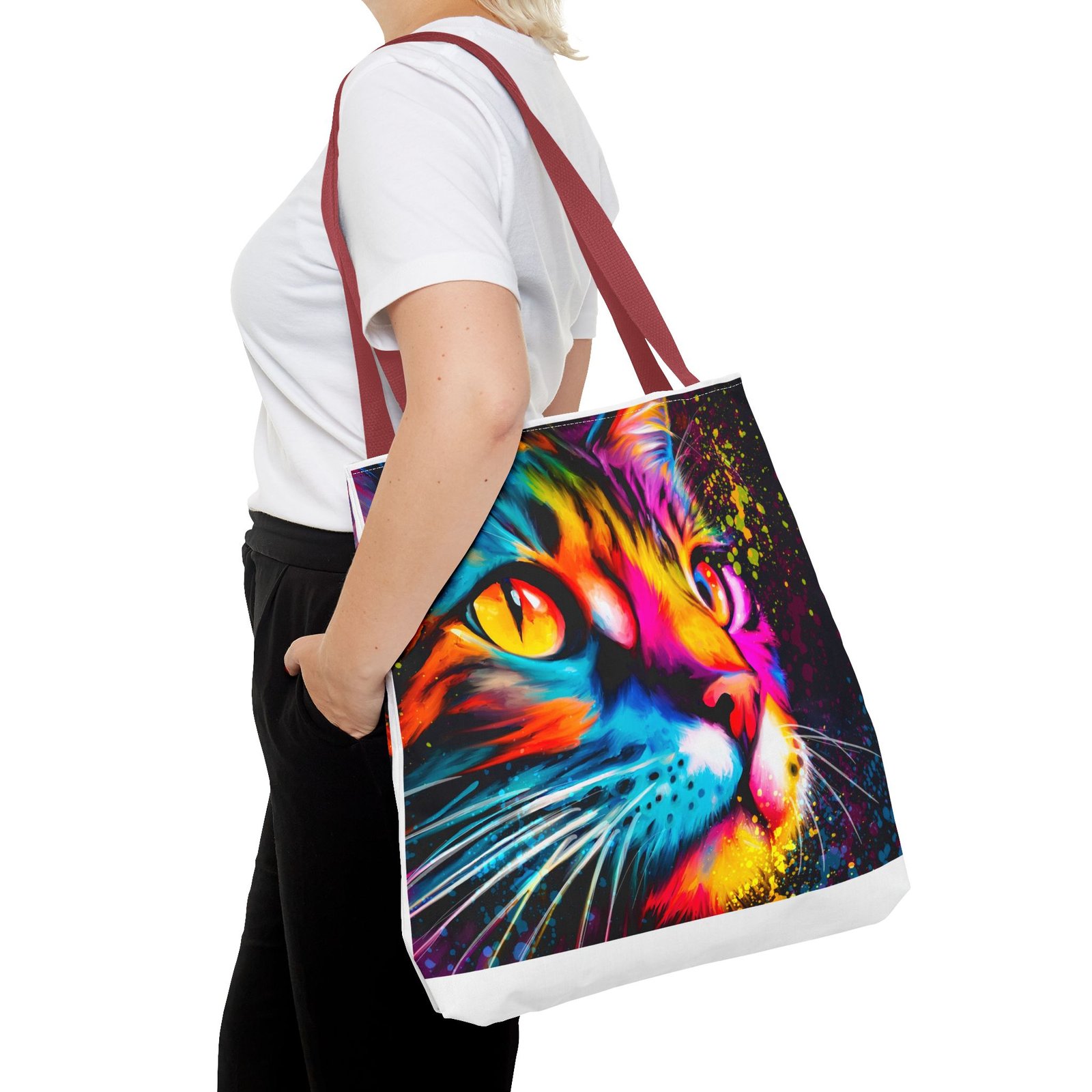Introducing a vibrant tote bag that bursts with personality! This eye-catching accessory showcases a stunning, colorful cat design that adds a playful touch to any outfit. Perfect for cat lovers and those looking to make a statement, this tote bag is both functional and stylish. Whether you’re heading to the grocery store, a day at the beach, or simply out for coffee, it’s designed to be your daily companion. Its sturdy construction ensures it can handle your everyday essentials while keeping you in the spotlight. Ideal for gifting during holidays, birthdays, or just to brighten someone’s day!