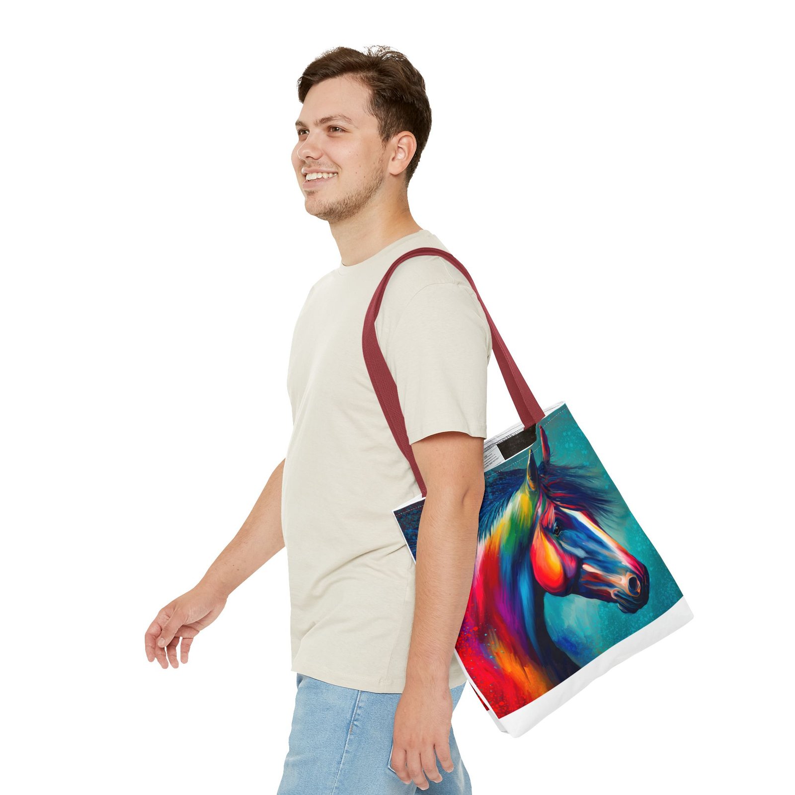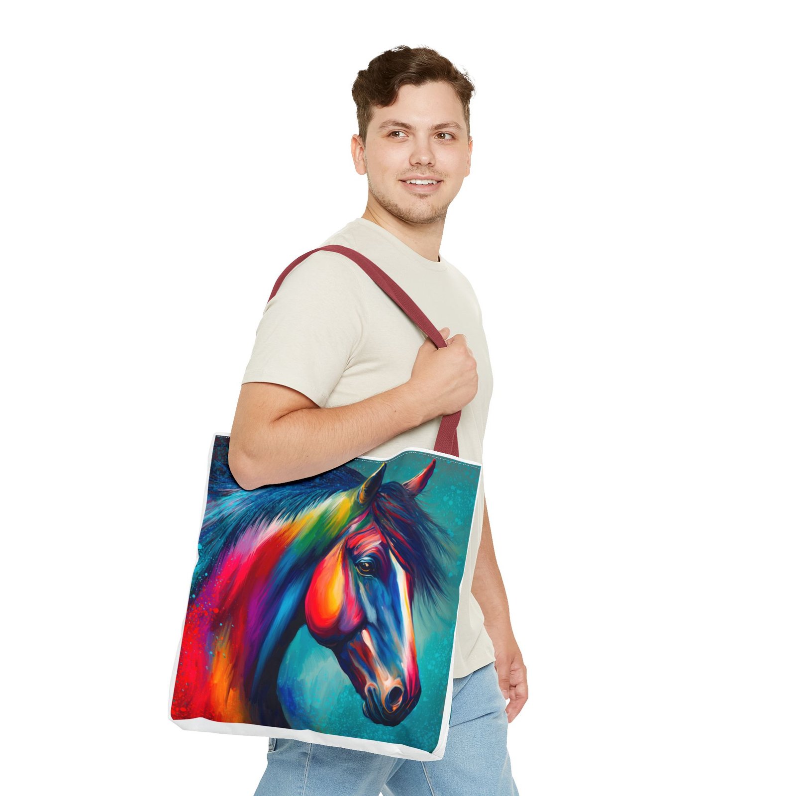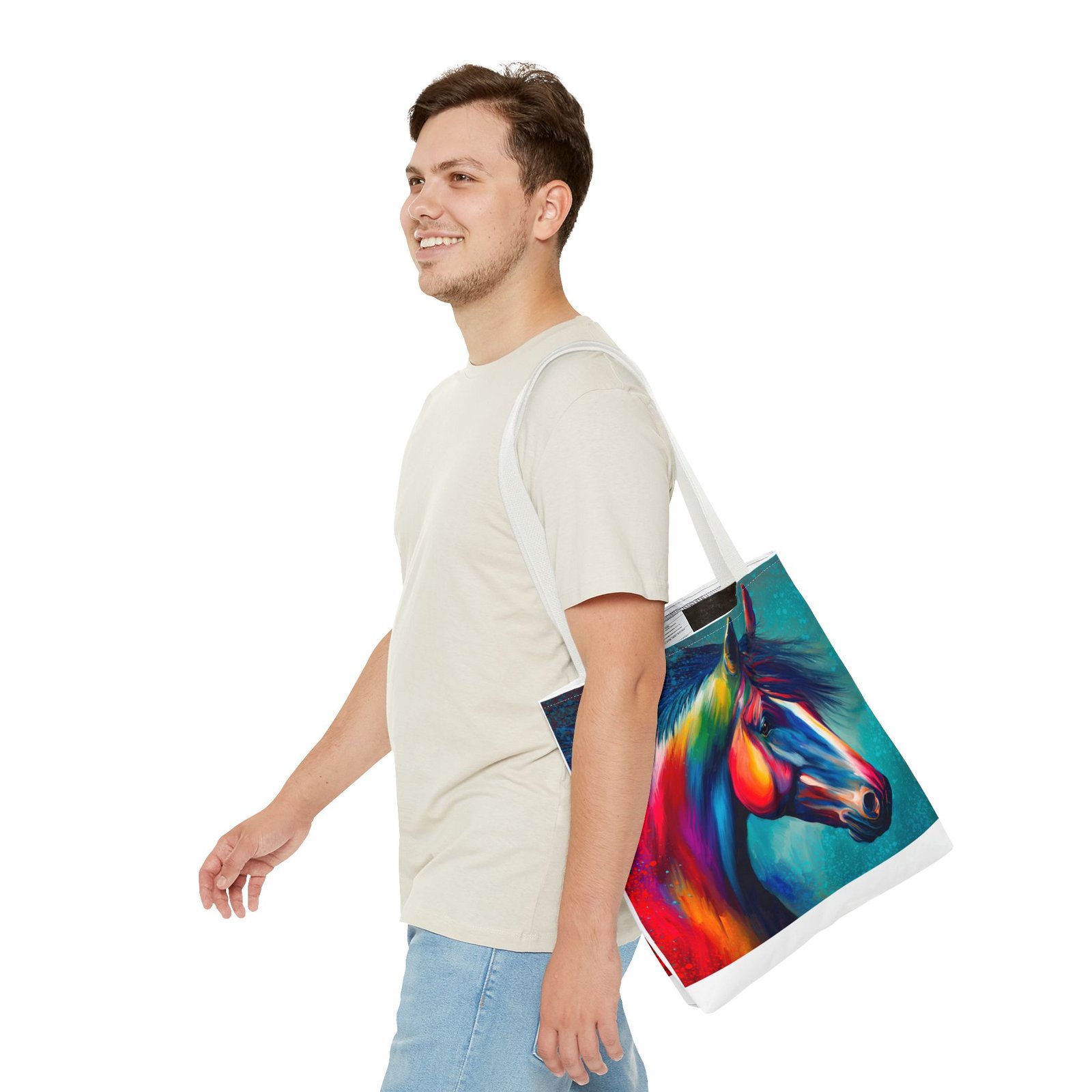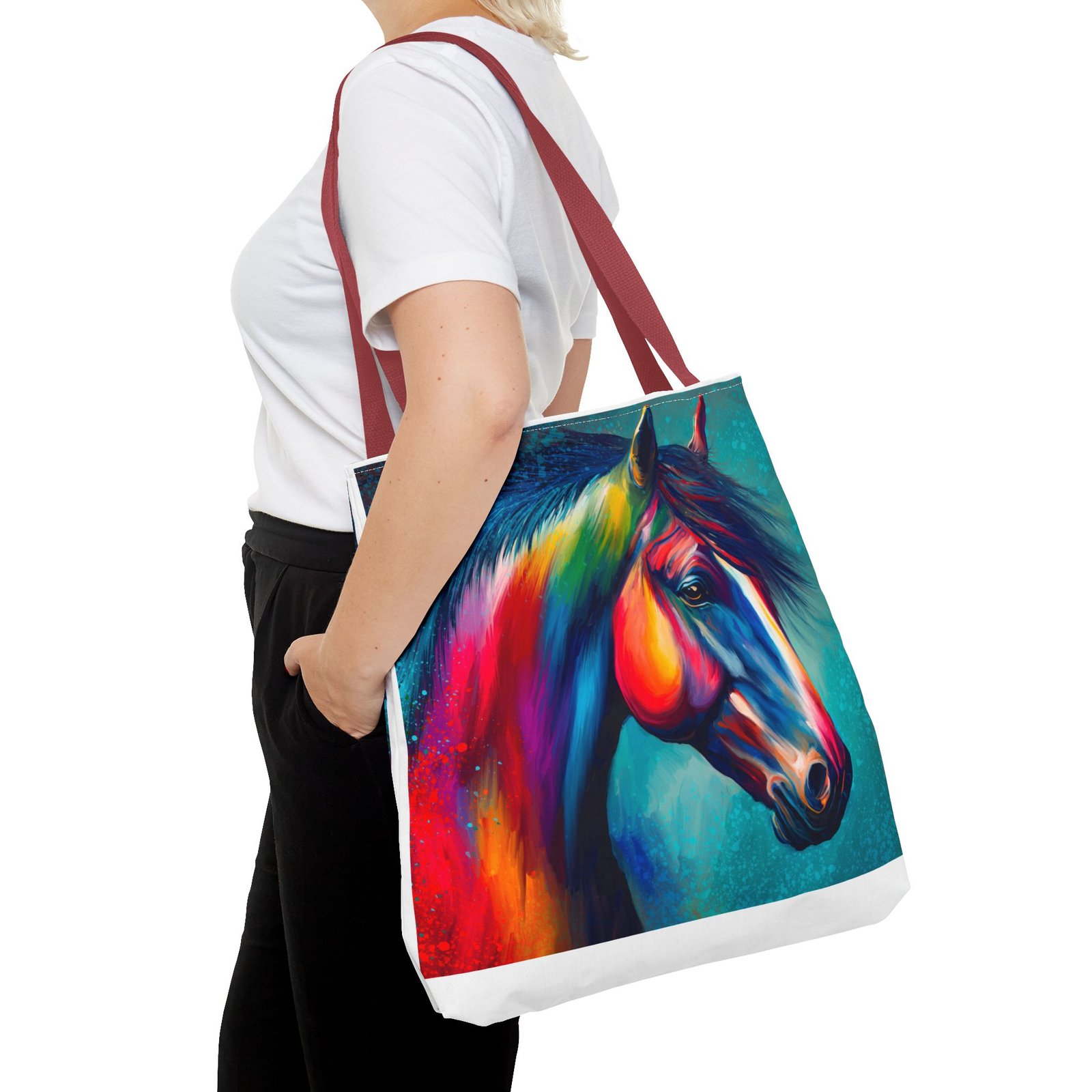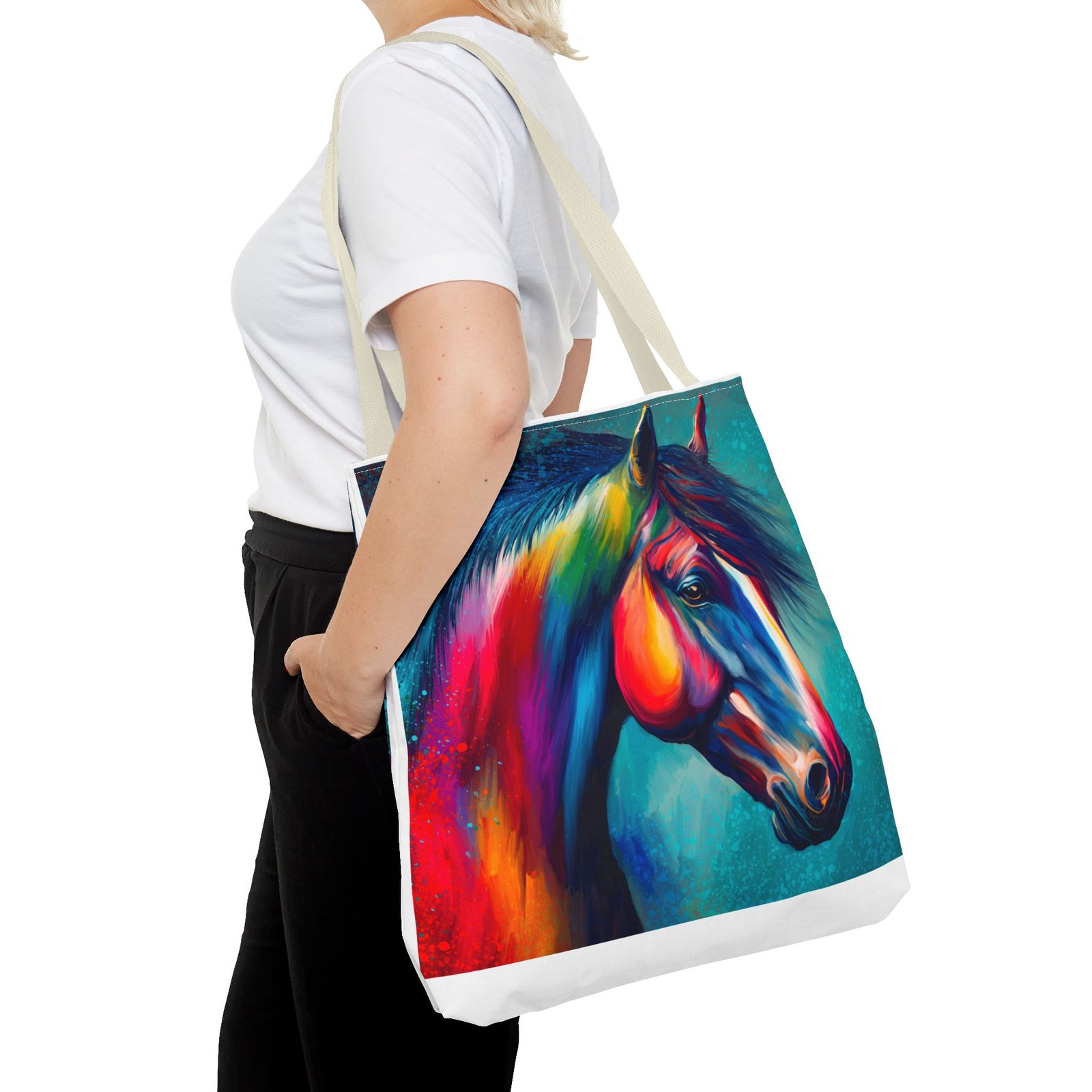 This vibrant tote bag is perfect for those who love to express their individuality and style. Featuring a stunning multi-colored horse design, it radiates a joyful and artistic vibe, making it an ideal accessory for everyday use. Whether you’re heading to the beach, running errands, or enjoying a picnic, this tote bag is both functional and fashionable. It’s especially relevant for animal lovers, artists, or anyone looking to add a pop of color to their life. Perfect for gifts during holidays, birthdays, or as a unique back-to-school item, this bag adds a personal touch to any occasion.